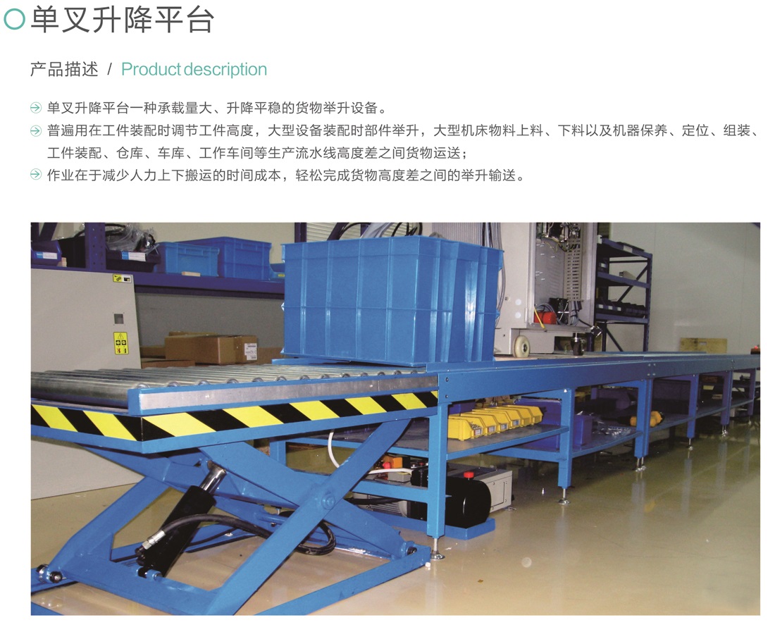 單叉升降平臺一種承載量大、升降平穩(wěn)的貨物舉升設(shè)備。普遍用在工件裝配時調(diào)節(jié)工件高度,大型設(shè)備裝配時部件舉升,大型機(jī)床物料上料、下料以及機(jī)器保養(yǎng)、定位、組裝、工件裝配、倉庫、車庫、工作車間等生產(chǎn)流水線高度差之間貨物運(yùn)送;作業(yè)在于減少人力上下搬運(yùn)的時間成本,輕松完成貨物高度差之間的舉升輸送。